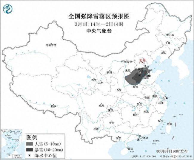 预计3月1日14时至3月2日14时,山西中南部、河北中南部、山东西北部、河南北部等地区有大雪,其中山西东南部、河北南部、山东西北部、河南北部等地部分地区有暴雪(10~16毫米)。上述部分地区新增积雪深度3~8厘米,局地可达10~15厘米。