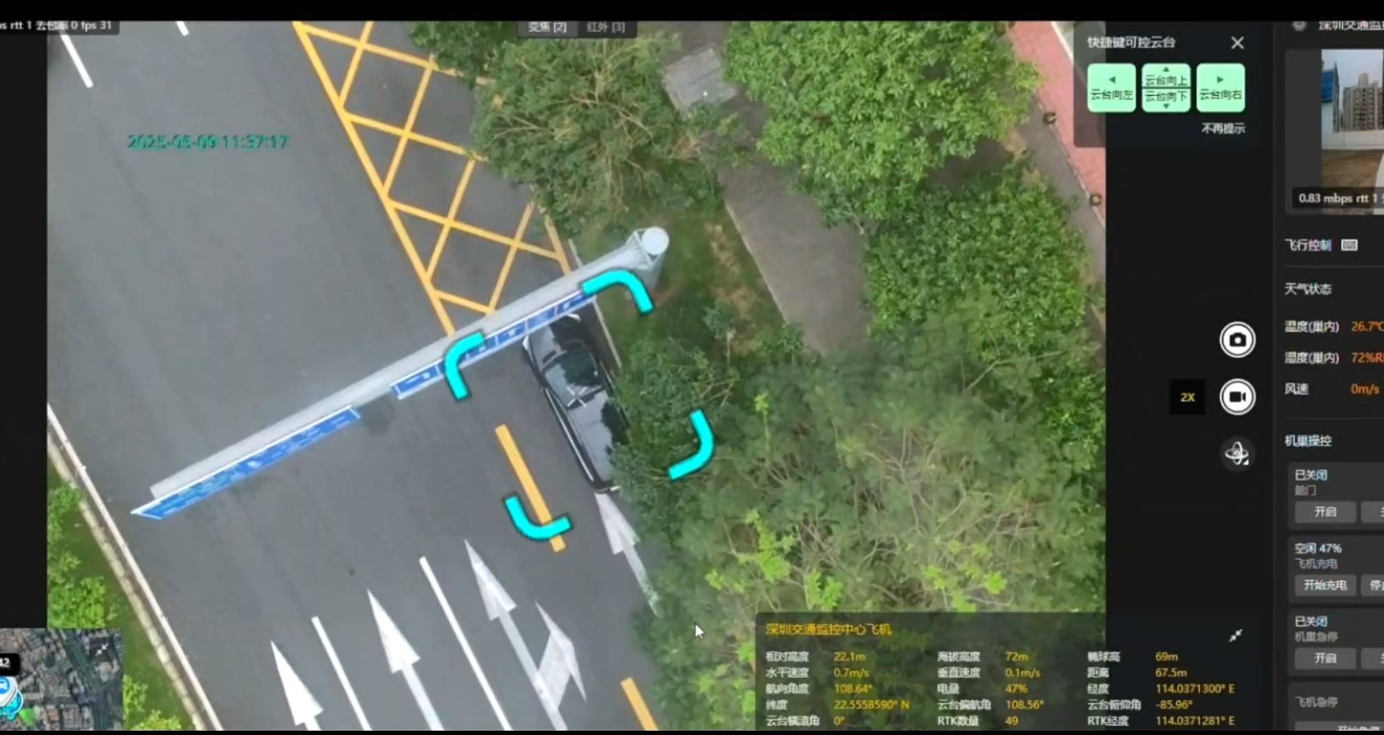 识别违停车辆。空中“违停球”上线,给违停行为念起“紧箍咒”。在机动车违停治理方面,依托道路信号灯杆部署的机巢无人机,已覆盖福田区多条严管路段、交通枢纽场站、违停易堵区域,如深南大道、北环大道主干道,福田口岸、保税区等人员车流密集区域,对违停车辆采取零容忍。无人机自主巡飞喊话,提醒车辆遵守交规、不违停。对严管路段未及时驶离车辆实现“识别—警示—抓拍—取证-告知”全链闭环,道路管理更精准高效